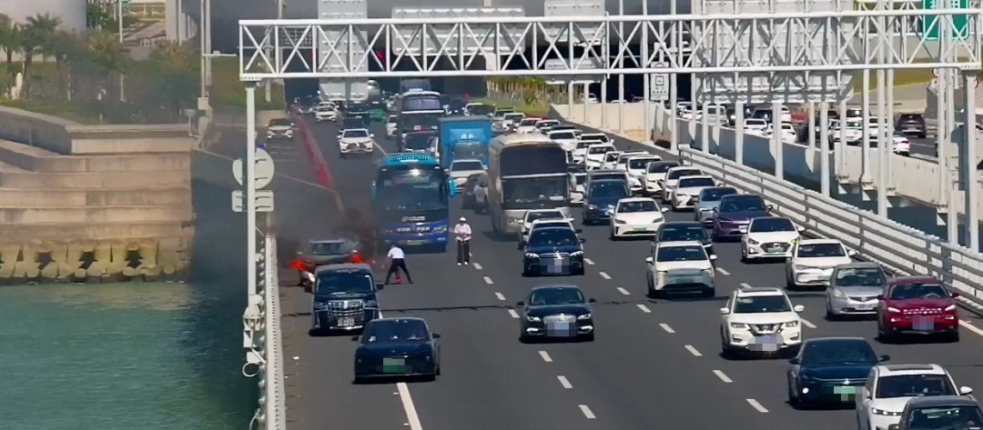 几乎是同时,一辆车牌号码为“粤B·97821D”的蓝色大巴车和一辆车牌号码为“粤Z·AG85澳”的黑色七座商务车停靠在侧,两名司机分别从车上、深中通道桥梁外侧护栏上的消防器材箱取下灭火器,与起火车辆驾驶员共同灭火。