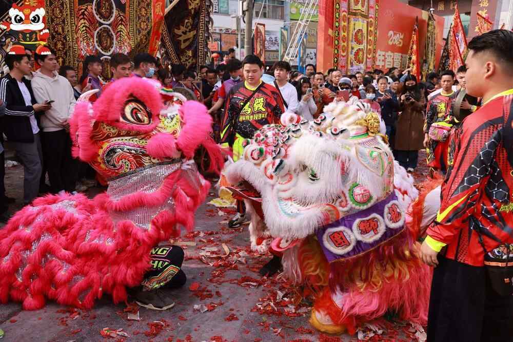 只见会狮时,南岭翕和堂、棣辉堂狮队恭迎来客醒狮,齐齐做弓腿垂首状,狮头轻蹭、互相跪拜,以示友好及尊重。会狮结束后,60余头醒狮在南岭辖内进行醒狮巡游,沿途与居民群众、商户亲切互动,传递着“吉祥如意好彩头”的开年祝福与美好愿景。