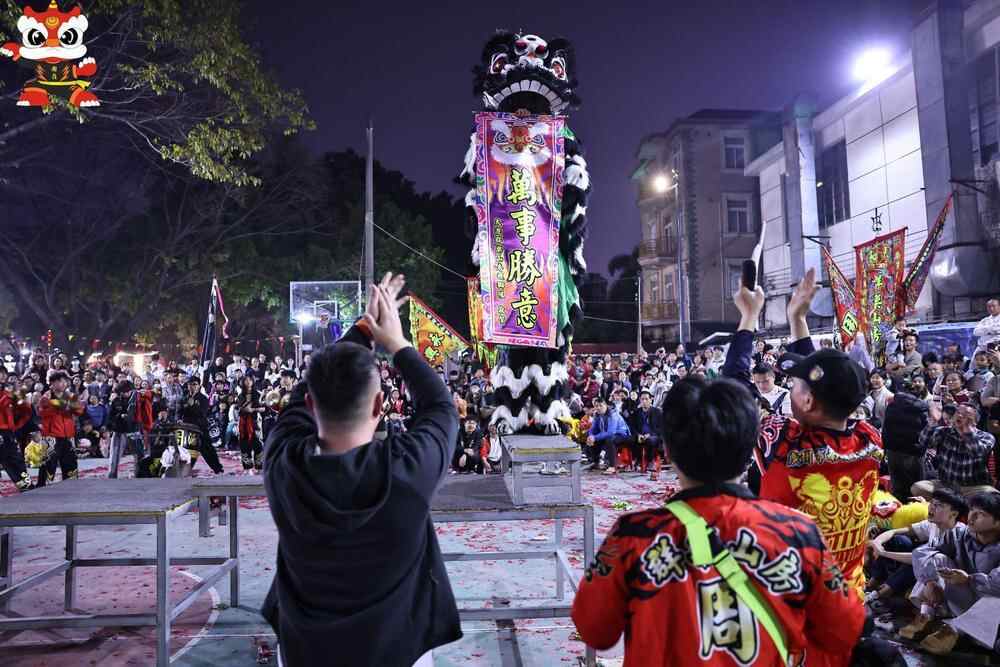 当晚的群狮表演更是将现场氛围推向高潮,群狮在锣鼓声中腾跃翻滚,眨眼、搔痒、舔毛的细节惟妙惟肖。来自粤港澳大湾区的狮队轮番上阵表演《步步高》《人月两团圆》《金蛇献瑞》等精彩节目,并展示“盆青”“台青”“凳青”等传统采青套路,赢得满场喝彩。压轴出场的是由南岭翕和堂醒狮队带来《勇闯高峰》的节目表演,尽显南岭村醒狮的独特魅力和深厚底蕴。活动当天共吸引线上近50万人次通过直播观赏活动盛况。